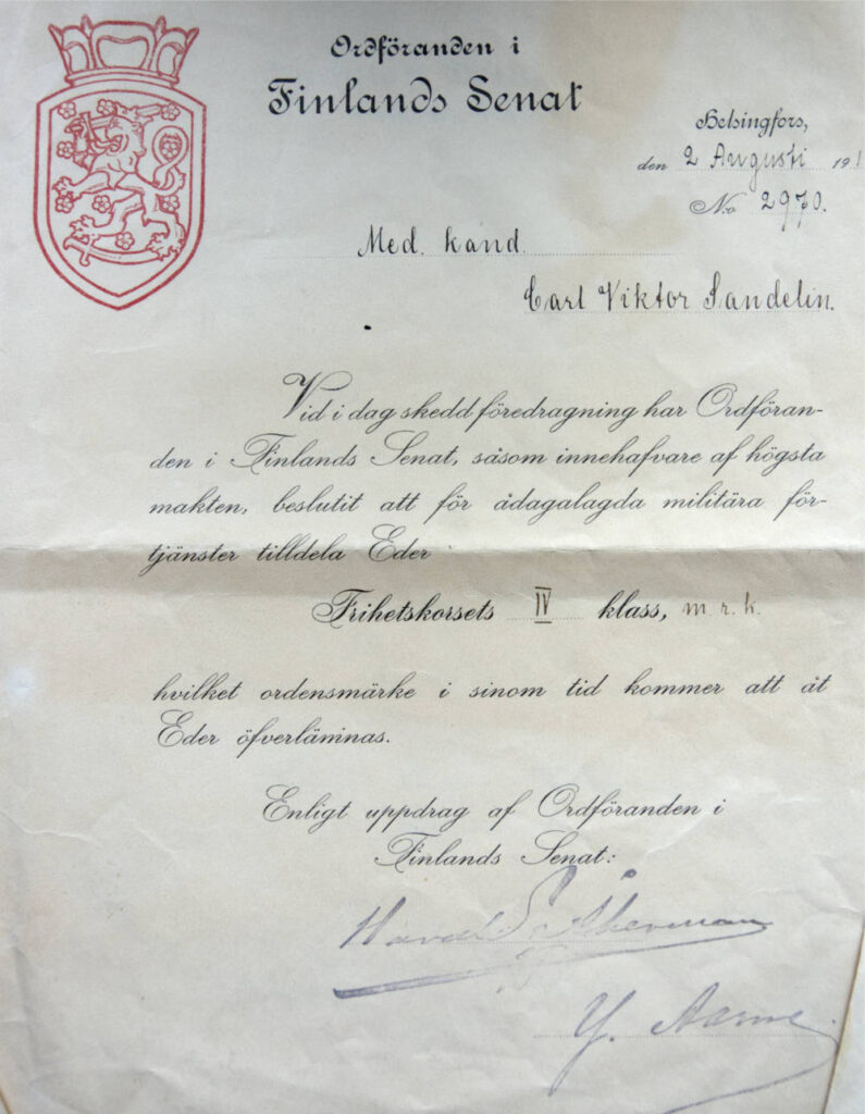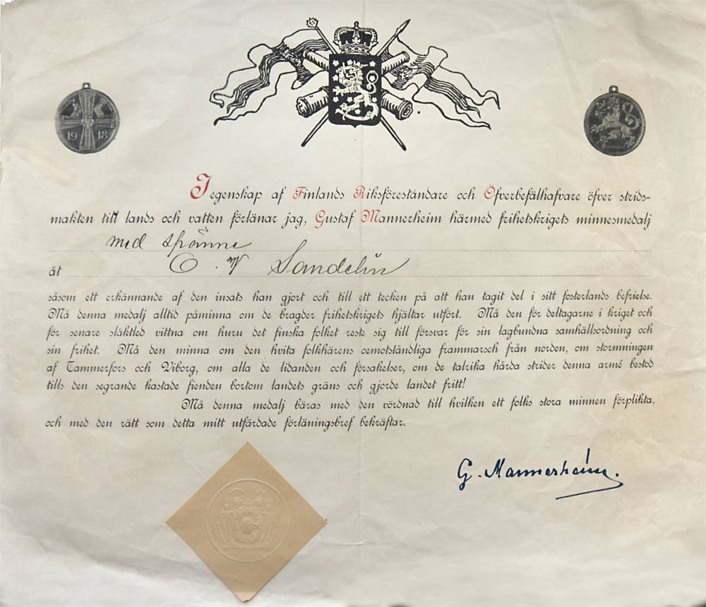 Och till minnet av min far hör givertvis även den av Gustaf Mannerheim undertecknade förläningen av Frihetskrigets minnesmedalj och den av ordföranden i Finlands senat, Harald Åkerman, undertecknde förläningen av Frihetskorsets IV klass med rött kors..